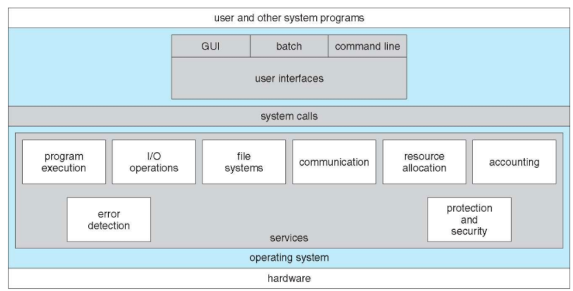 - User interface, Program execution, I/O operation, File-system manipulation,