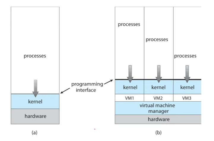 Virtual Machine Manager 을 이용하여 다중 OS를 실행. > VMM은 OS scheduling을 함.