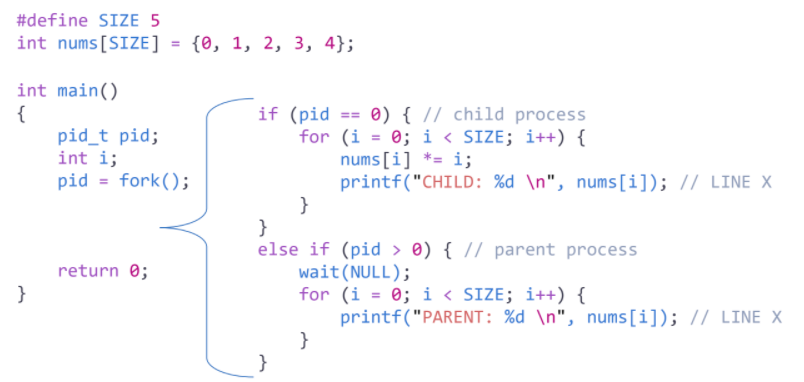 wait가 걸려있으므로, Child가 먼저 실행된다. Context가 전체 복제됨으로 전역변수 또한 복사가 되어 Parent 출력은 nums elements가 값의 변화가 없이 순서대로 출력된다.