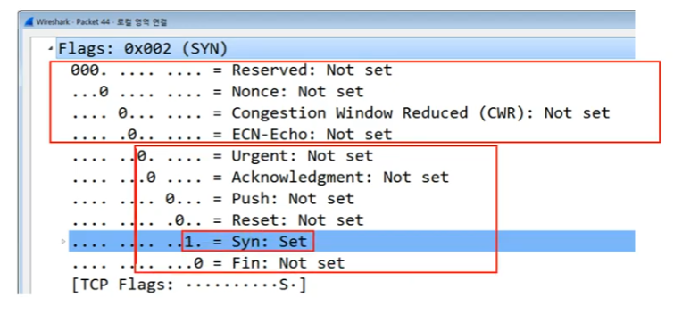 S (SYN) : Synchronization Flag - Sequence 번호를 동기화 하고 연결 수립을 요청하겠다는 패킷. (연결을 시작할 때 반드시 사용하는 Flag)