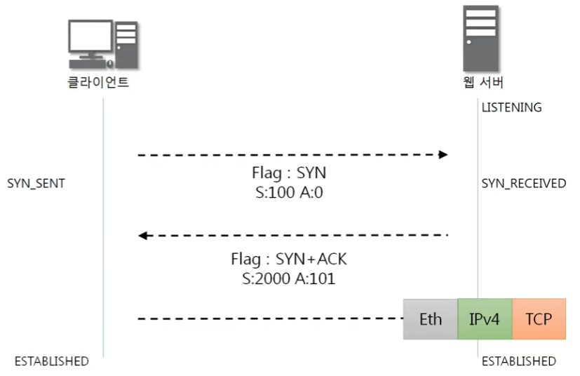 2) 서버가 클라이언트의 요청을 받아들이는 패킷을 보냄.
