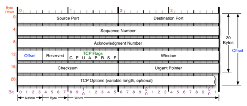 TCP 또한 IPv4 처럼 4byte씩 증가하며 Option이 붙을 수 있고, 최대 10개까지 가능하다. 최대 60 Byte.