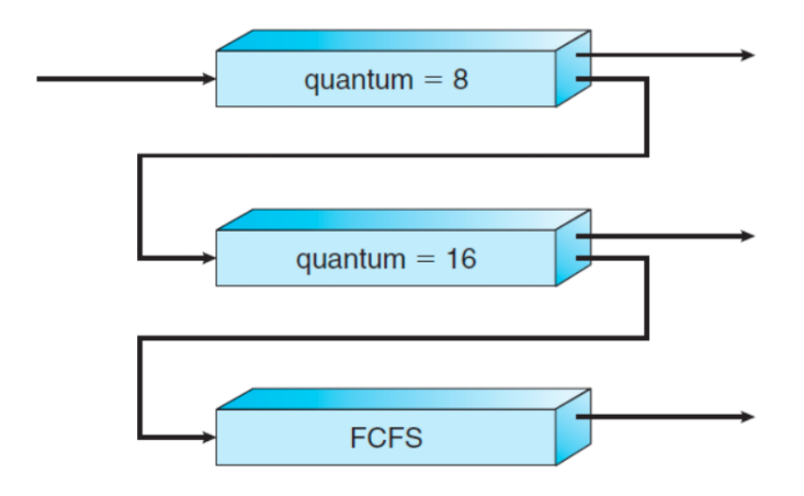Priority를 주되, 처리는 끝날 때 까지 하지 않고, time quantum에 따라 쪼개어 처리한다. 즉 마지막 우선순위인 프로세스도 CPU를 점유받게 된다.
