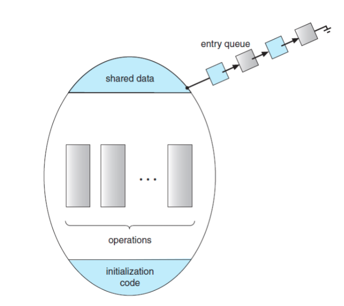 - A monitor type is an ADT that includes a set of programmer-defined operations that are provided with mutual exclusion within the monitor. (하나의 클래스)