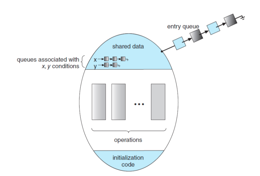 - A monitor type is an ADT that includes a set of programmer-defined operations that are provided with mutual exclusion within the monitor. (하나의 클래스)