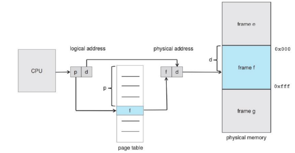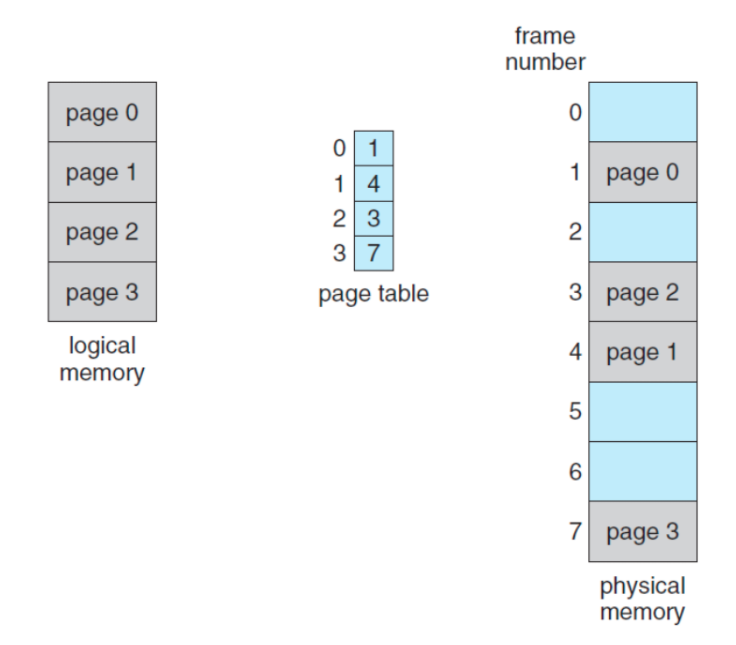- break physical memory into fixed-sized blocks (frames) and break logical memory into blocks of the same size. (pages)