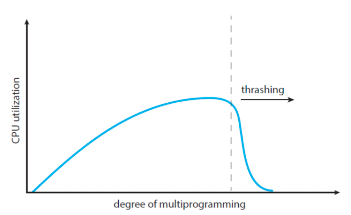 page fault가 일어나면 process는 계속해서 wait 상태로 전환 되었다가 다시 동작한다. 이것이 매우 많이 발생한다면 막상 CPU는 작업을 하지 않고 Page를 기다리는 시간이 높아진다. 이를 Thrashing이라 한다.