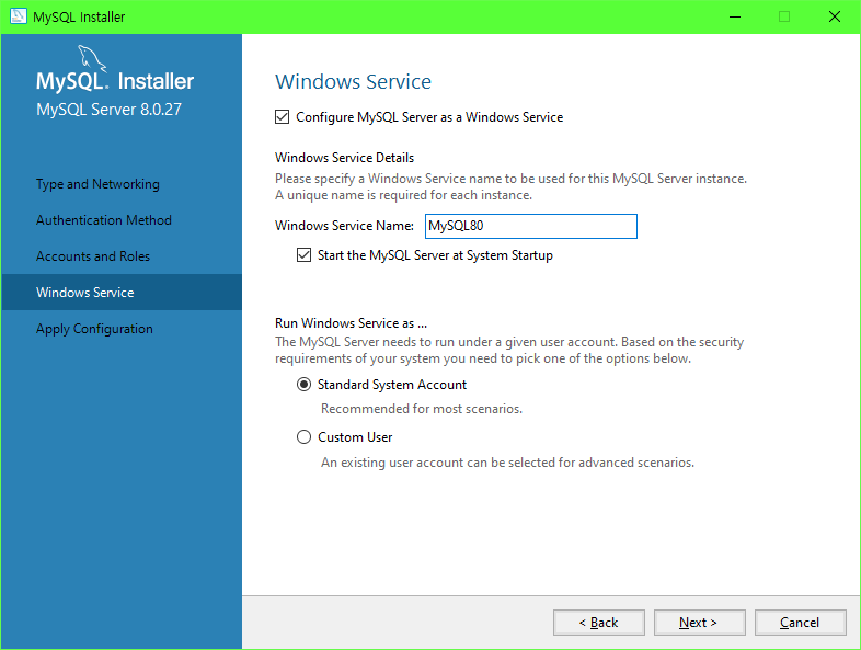 MySQL Sever Program은 Windows Service상에 올라가 백그라운드 모드에서 계속 실행됩니다.