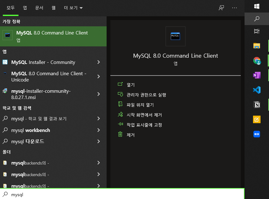 mysql를 검색하여 Command Line이란 프로그램을 실행시킵니다. 그 후 로그인후 창을 닫아주시면 정상적으로 동작하는 모습을 확인할 수 있습니다.