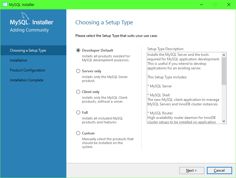 보통은 Default로 설치합니다만, 저 같은 경우에는 SQL 연습용으로 설치하는 것이라 Custom을 선택하여 Server 만을 설치합니다.