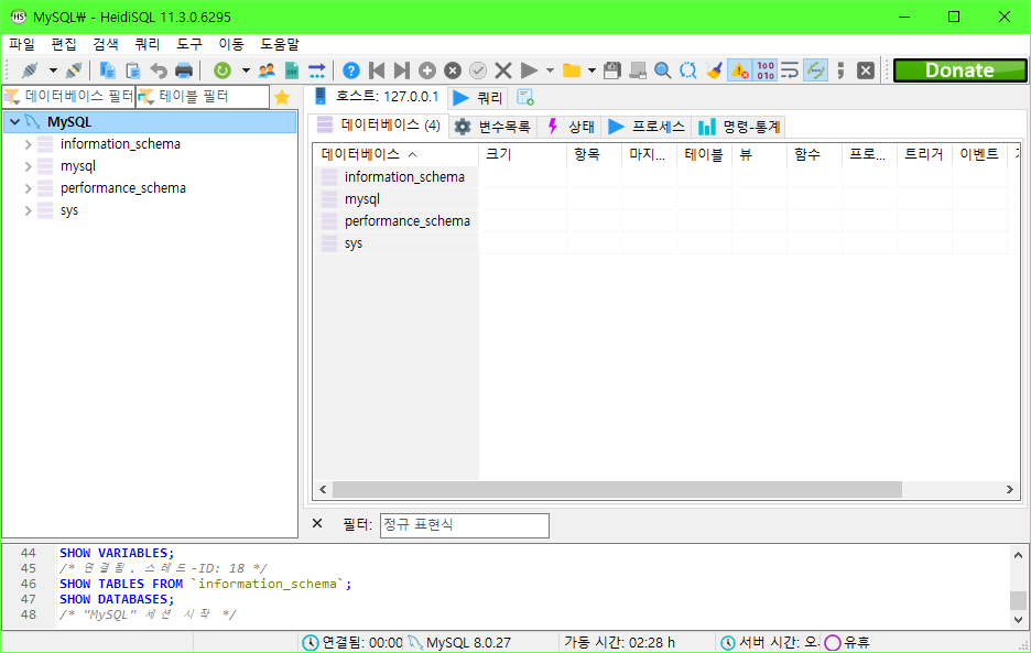 추가로 Workbench 또한 좋은 IDE 이나, 저는 이전부터 사용해왔던 Heidi SQL을 사용합니다.